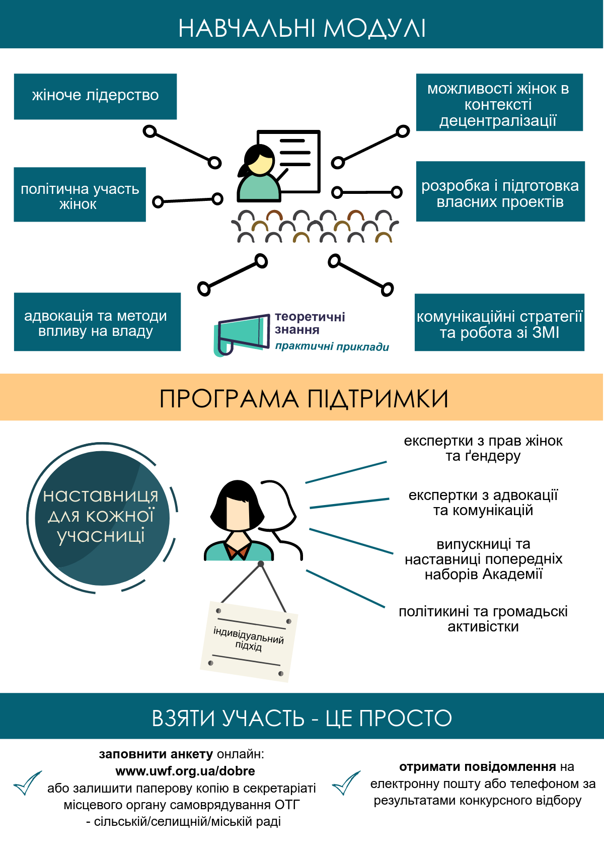Ми шукаємо активних жінок, які готові працювати задля розвитку та процвітання власної громади, жінок, які прагнуть позитивних змін, але яким не вистачає впевненості та команди для їхнього втілення, жінок, які мають ідею, але поки не знають що з нею робити!