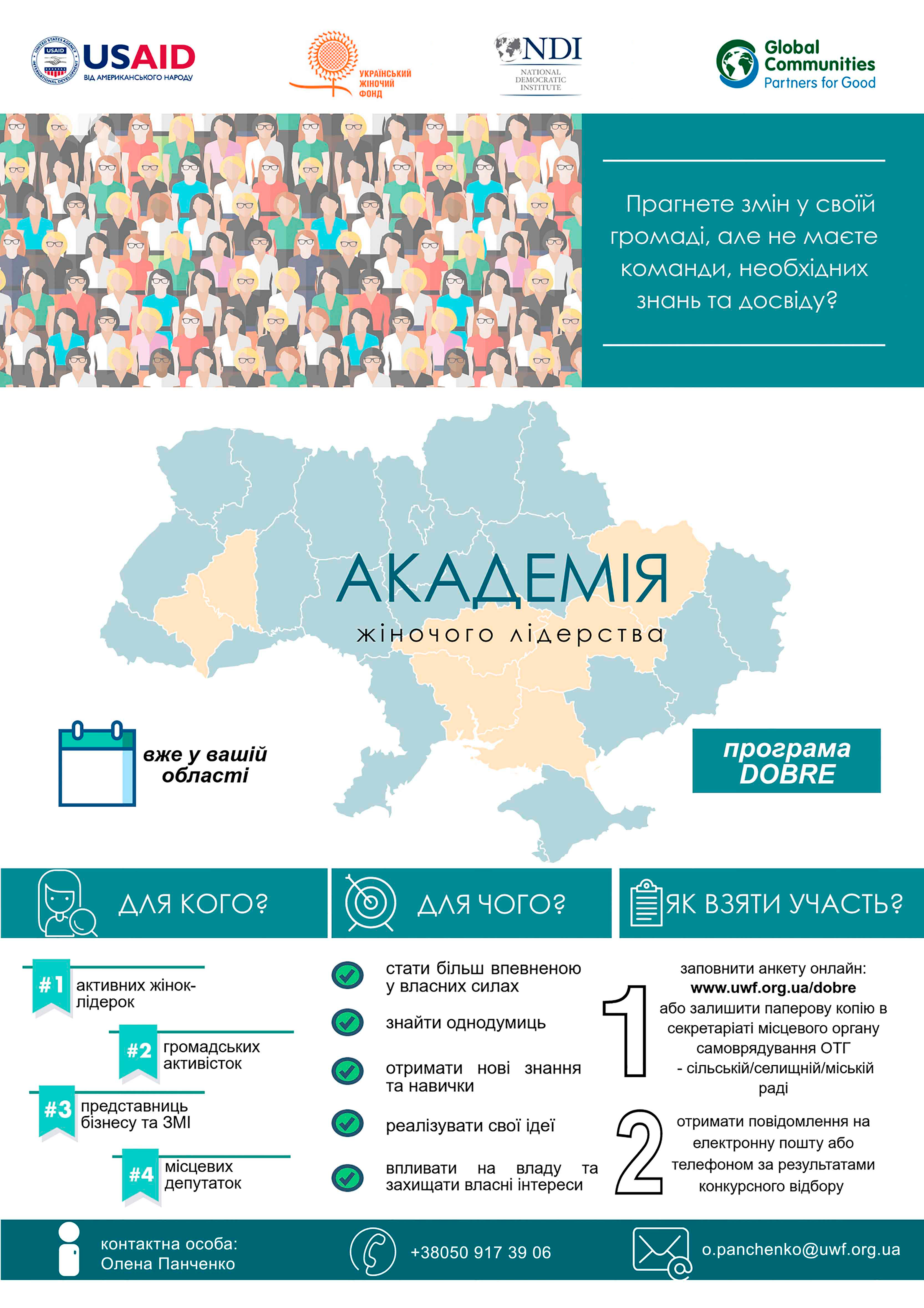 З будь яких питань будь ласка звертайтеся до контактної особи у вашій громаді, або координаторки Академії Олени Панченко за телефоном 050 917 39 06 або електронною поштою o.panchenko@uwf.org.ua