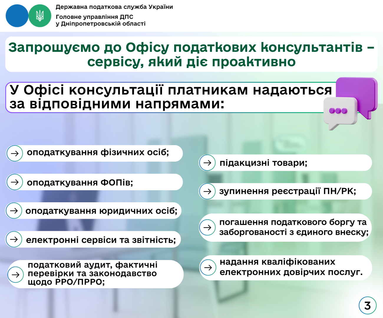 Головне управління ДПС у Дніпропетровській області нагадує, що з 08.09.2025 на Дніпропетровщині запрацював Офіс податкових консультантів (Офіс).