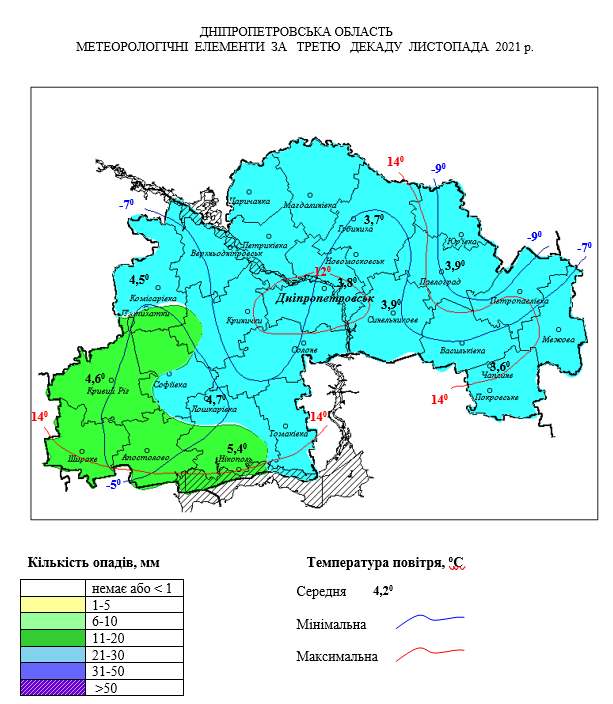 В третій декаді листопада на Дніпропетровщині переважала аномально тепла, з істотними опадами в другій половині декади погода. Середньодобові температури повітря в більшості часу декади на 1-10о перевищували норму або були близькі до неї і знаходились у межах 1-10о тепла, лише в окремі дні першій п’ятиденці декади вони були на 1-4о нижчі за норму і становили 0-4о морозу.