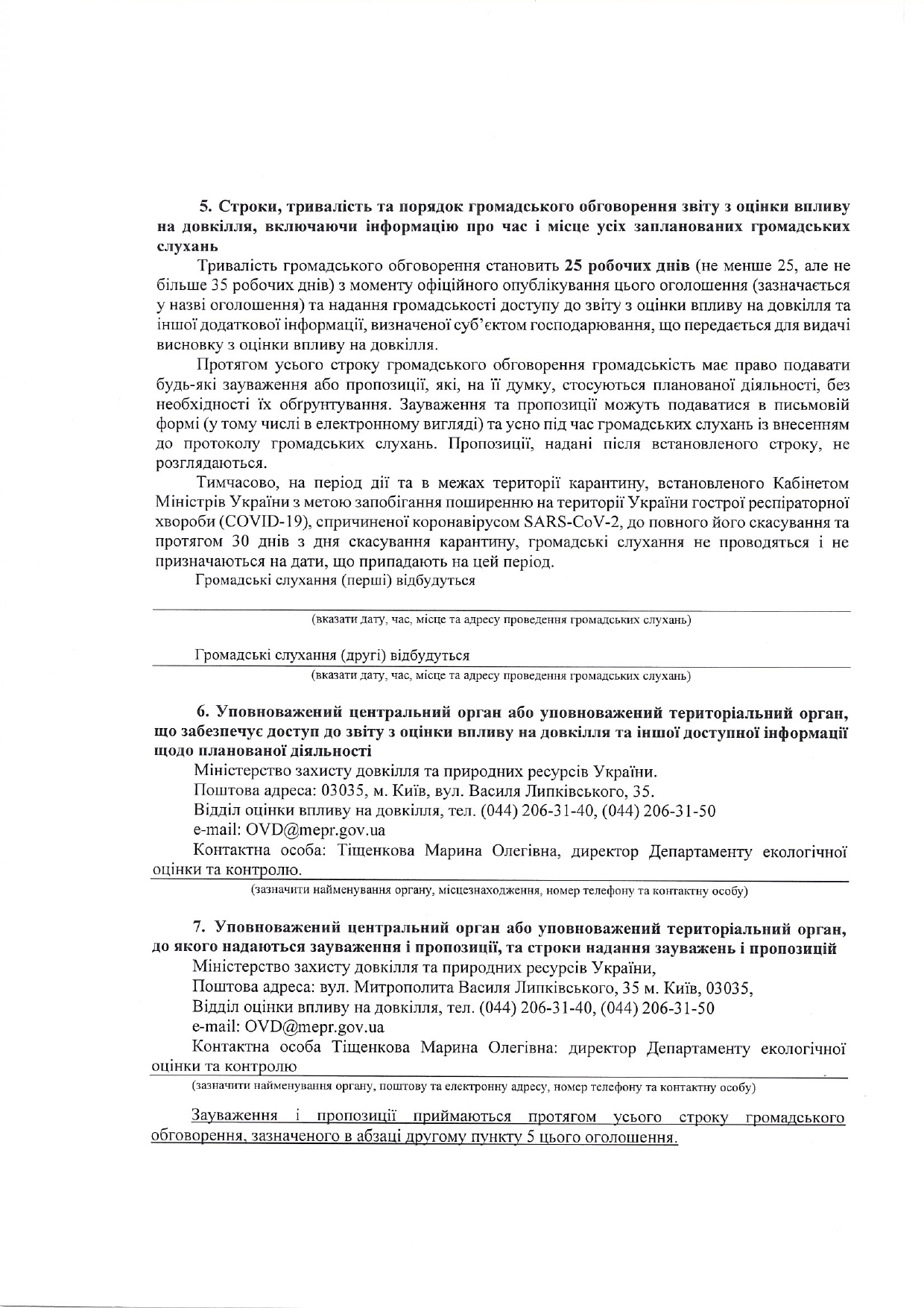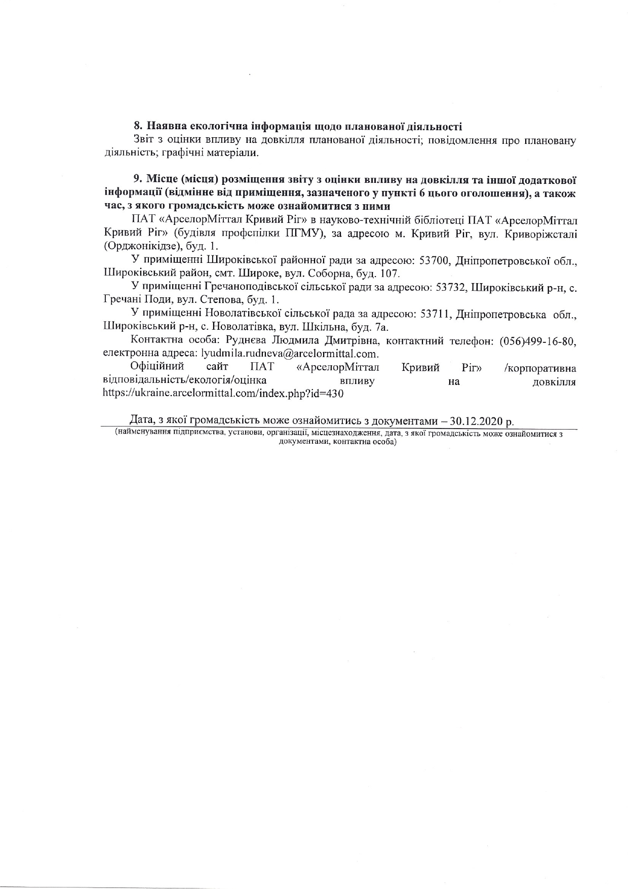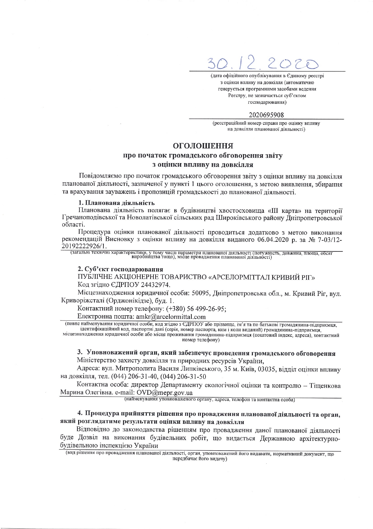 Оголошенння про початок громадського обговорення звіту з оцінки впливу на довкілля