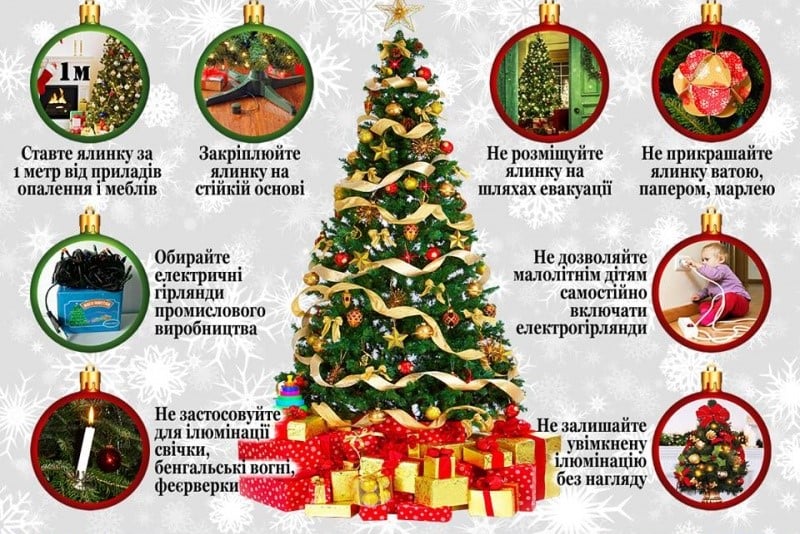 – у приміщенні, де встановлено ялинку, необхідно обладнати протипожежний куточок, в якому мають знаходитися вогнегасники, вода та спеціальні покривала;