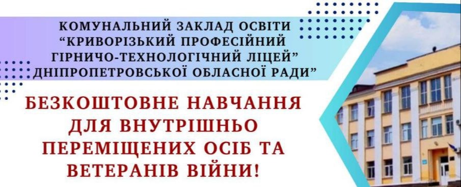 Криворізький Професійний Гірничо-Технологічний Ліцей запрошує внутрішньо переміщених осіб та ветеранів війни на безкоштовне навчання за професією: